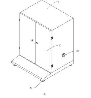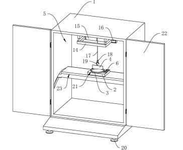 參照圖1,包括殼體1、工作臺2、盛液盒3和標準板4,殼體1內(nèi)設(shè)置有工作腔5,殼體1底部設(shè)置有多個支撐腳20,在本申請實施例中,支撐腳20設(shè)置為四個,四個支撐腳20設(shè)置于殼體1的四角位置;殼體1上鉸接有兩轉(zhuǎn)動門22;工作臺2設(shè)置于工作腔5內(nèi),工作臺2上開設(shè)有與盛液盒3適配的放置槽21,盛液盒3可放置于放置槽21中,標準板4設(shè)置于盛液盒3上方,標準板4通過升降結(jié)構(gòu)可升降連接于殼體1上,工作臺2上固定連接有水平儀6,在本申請實施例中水平儀6選用氣泡式水平儀,也可選擇其他體積較小的水平儀;工作臺2和殼體1之間設(shè)置有用于調(diào)平工作臺2的調(diào)平結(jié)構(gòu)。