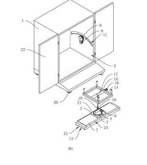 參照圖2和圖3,調(diào)平結(jié)構(gòu)包括調(diào)節(jié)板7、齒輪一8、齒輪二9和用于驅(qū)動齒輪二9轉(zhuǎn)動的旋鈕10,調(diào)節(jié)板7轉(zhuǎn)動連接于殼體1內(nèi),殼體1上開設(shè)有供調(diào)節(jié)板7移動的滑槽11,調(diào)節(jié)板7的底面呈弧形凹面12設(shè)置且弧形凹面12上開設(shè)有齒槽13,調(diào)節(jié)板7頂面的兩側(cè)邊倒有倒角23;齒輪一8和齒槽13嚙合;齒輪一8和齒輪二9均轉(zhuǎn)動連接于殼體1上,齒輪一8和齒輪二9嚙合,齒輪二9的齒數(shù)小于齒輪一8的齒數(shù),從而達到一個減速的作用,旋鈕10設(shè)置于殼體1外。