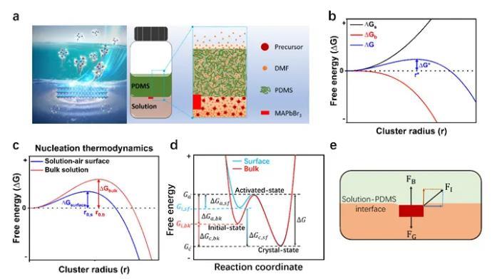 圖1. MAPbBr3鈣鈦礦結(jié)晶與晶體生長。(a) PDMS輔助結(jié)晶原理圖;(b) 形核半徑與自由能的關(guān)系;(c) 溶液的表面和內(nèi)部的形核半徑的比較;(d)生長過程中自由能變化圖解;(e)界面懸浮生長的力學(xué)圖解。