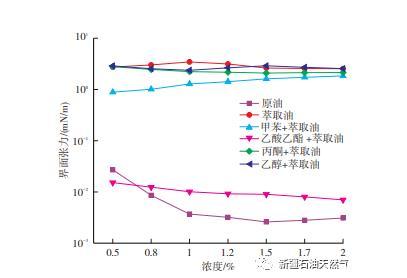 圖4為原油、萃取油以及萃取油分別添加濃度為1%的甲苯洗脫物、乙酸乙酯洗脫物、丙酮洗脫物、乙醇洗脫物配成的模擬油與0.5%,0.8%,1%,1.2%,1.5%,1.7%,2%這七種濃度Na2CO3的界面張力??梢钥闯觯宜嵋阴ハ疵摻M分與堿的界面張力最低。隨著Na2CO3濃度變大,界面張力也持續(xù)降低,當(dāng)Na2CO3濃度達(dá)到2%時,其界面張力達(dá)到10-3 mN/m。孫景倫等研究了復(fù)合驅(qū)油體系中堿與原油的相互作用,發(fā)現(xiàn)Na2CO3更易于環(huán)烷酸以及苯環(huán)和不飽和酸部分反應(yīng);與飽和酸相比,環(huán)烷酸以及苯環(huán)和不飽和酸的界面活性更強,導(dǎo)致界面張力更低。