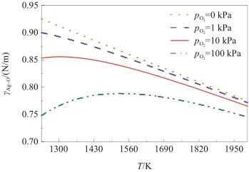 圖6研究了在不同氧氣壓力條件下,γAg-O隨溫度的變化關(guān)系。由圖可知,當(dāng)氧氣壓力低于10 kPa時(shí),γAg-O與溫度呈負(fù)相關(guān)。而當(dāng)氧氣壓力高于10 kPa時(shí),隨著溫度升高,γAg-O呈現(xiàn)先增大后減小的趨勢,并且隨著氧氣壓力增加,這種轉(zhuǎn)變幅度增大。這是因?yàn)棣肁g-O受溫度和氧溶解度的共同影響。一方面,隨著溫度升高,液態(tài)Ag的表面張力(γAg)降低,從而導(dǎo)致γAg-O降低;另一方面,液態(tài)Ag-O系中的氧溶解度與溫度呈負(fù)相關(guān),當(dāng)溫度升高時(shí)氧溶解度下降,導(dǎo)致表面氧吸附量減少,進(jìn)而引起γAg-O增加。因此,當(dāng)溫度較低時(shí),氧溶解度成為影響γAg-O的主要因素;而在較高的溫度條件下,溫度成為主要因素。