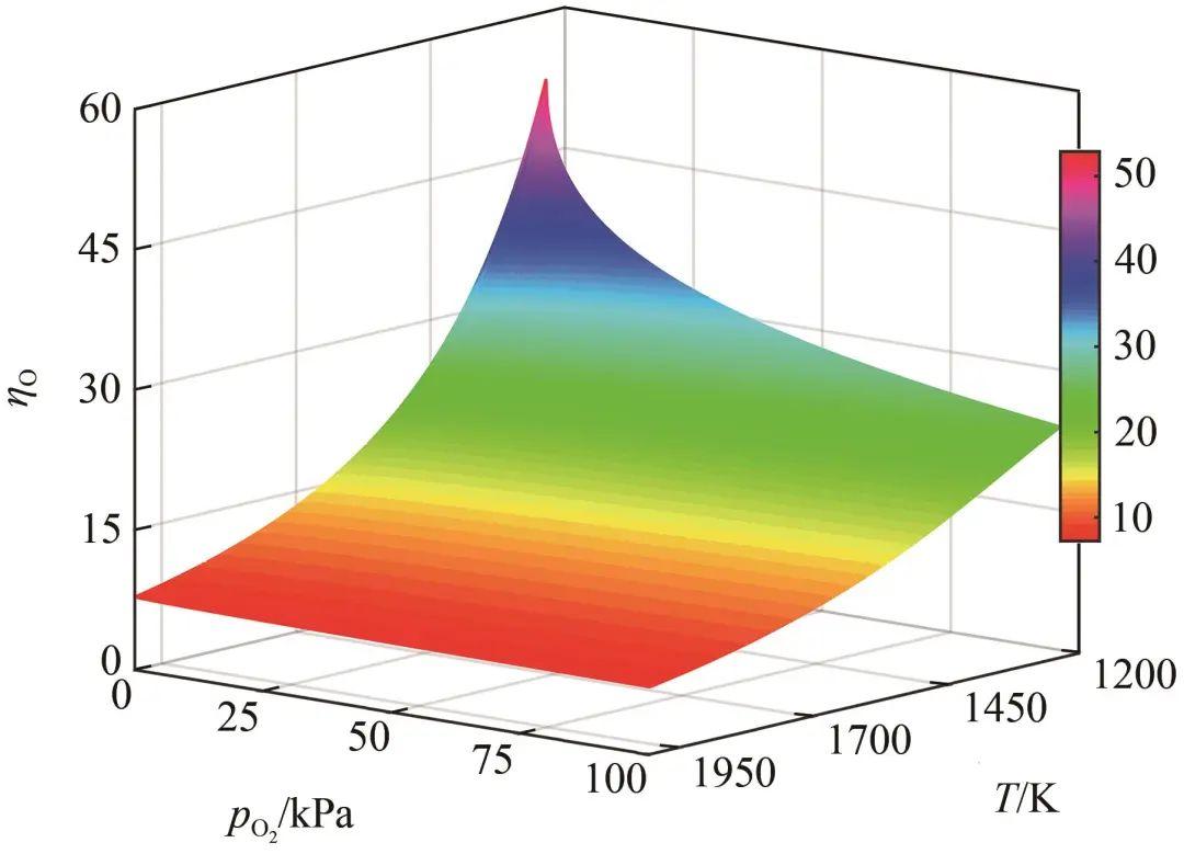 由圖7可知,當(dāng)溫度低于1500 K時(shí),ΓO,Ag隨氧氣壓力升高顯著增加;當(dāng)溫度高于1500 K時(shí),由于液態(tài)Ag-O系中的氧溶解度顯著降低,ΓO,Ag隨氧氣壓力的增加,其增加幅度減小。觀察圖8可知,η隨著溫度和氧分壓的升高而呈現(xiàn)下降趨勢。這是因?yàn)槭?27)中的表面偏析平衡系數(shù)KII與溫度呈負(fù)相關(guān),當(dāng)溫度升高時(shí)KII減小,導(dǎo)致表面氧濃度降低。此外,在較低的氧分壓條件下,O原子傾向富集于表面;當(dāng)氧分壓升高時(shí),更多的O原子溶入液態(tài)Ag-O系中,引起η減小。