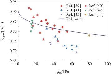 根據(jù)式(33),計(jì)算了1350 K下液態(tài)Ag-O系的表面張力γAg-O,并將計(jì)算結(jié)果與文獻(xiàn)數(shù)據(jù)[39-44]進(jìn)行比較,如圖5所示。觀察圖5可知,γAg-O與氧氣壓力呈負(fù)相關(guān)。在較低的氧氣壓力下,γAg-O的下降幅度比較顯著;而隨著氧氣壓力增加,γAg-O的下降幅度逐漸減小。另外,計(jì)算結(jié)果與文獻(xiàn)[39,40,44]吻合良好,但高于文獻(xiàn)[41-43]。這種差異是可以接受的,因?yàn)樗捎媚P蛢H考慮了溫度和氧氣壓力,而在實(shí)驗(yàn)過程中,系統(tǒng)的表面張力不可避免地受到雜質(zhì)的影響。