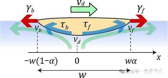 圖6是描述BS液滴自推進(jìn)的簡(jiǎn)化模型。紅色箭頭所示的γf和γb分別代表液滴前部和后部界面張力所產(chǎn)生的力的大小。用藍(lán)色箭頭繪制的τf和τb分別代表來(lái)自向前和向后界面流的粘性力。綠色箭頭表示液滴下方的流動(dòng),vb、vd和vf表示液滴下方每個(gè)x位置處的流速。假設(shè)τb和vb具有負(fù)值,因?yàn)樗鼈兲幱谝旱芜\(yùn)動(dòng)的相反方向。