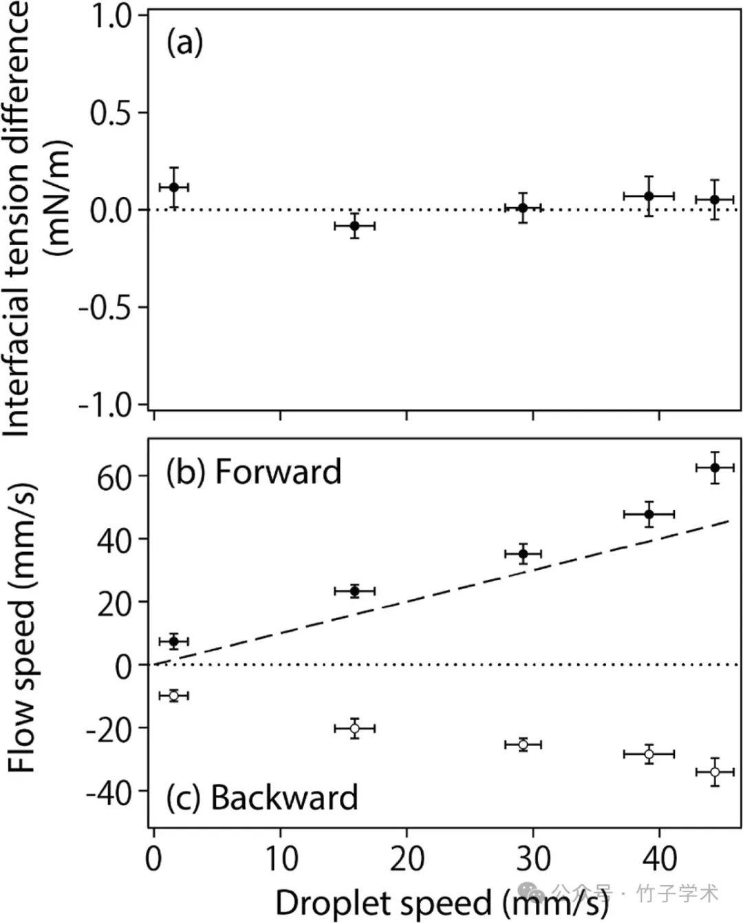 圖5是液滴速度與(a)液滴前后部之間的界面張力差、(b)向前流動(dòng)速度(實(shí)心圓圈)和(c)向后流動(dòng)速度(空心圓圈)的關(guān)系。水平虛線(xiàn)表示零,虛線(xiàn)表示液滴速度與前進(jìn)流速相同時(shí)的情況。