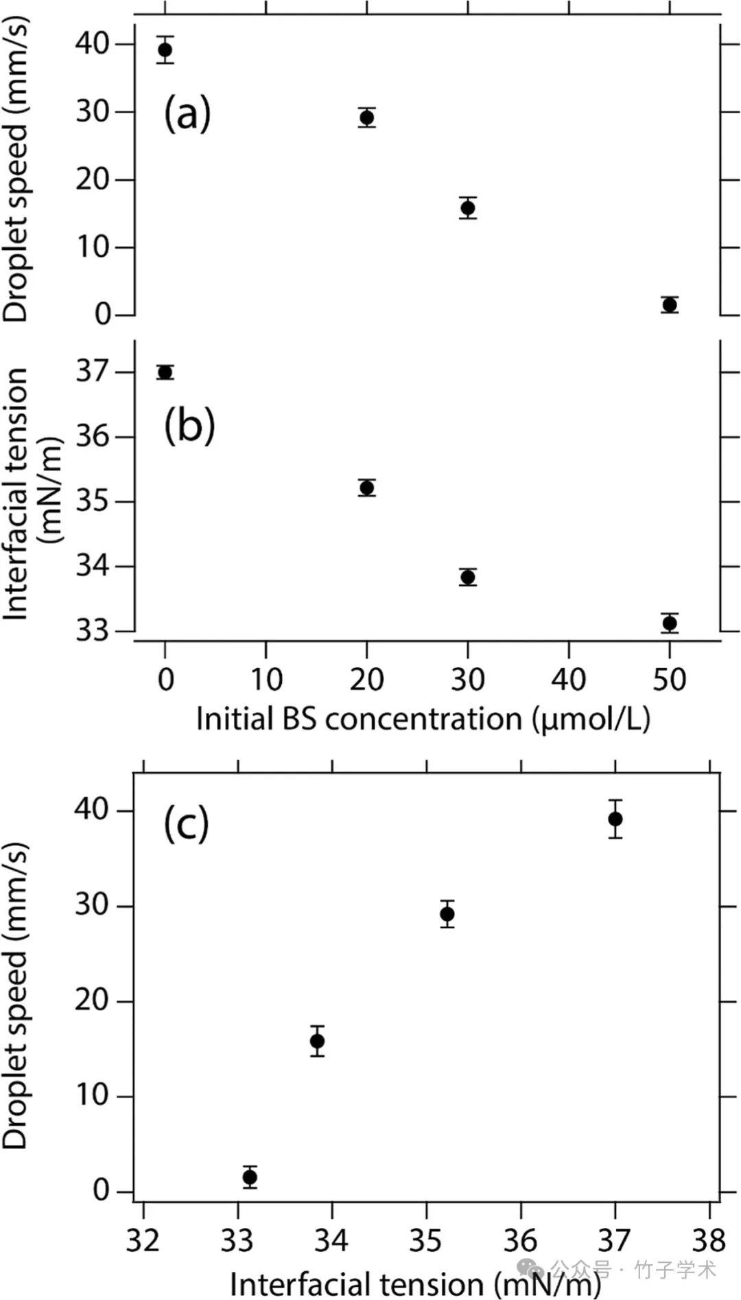 圖2(a,b)液滴速度、平衡界面張力(空氣/液體)和初始BS濃度之間的關(guān)系。(c)結(jié)果(a,b)中液滴速度與平衡界面張力(空氣/液體)之間的關(guān)系。