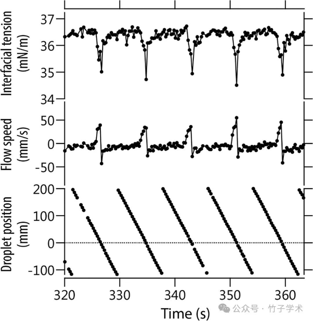 圖3是選定時(shí)間范圍內(nèi)液滴位置、界面張力和表面流速的時(shí)間分辨測(cè)量的代表性結(jié)果(初始BS濃度:0μM)。