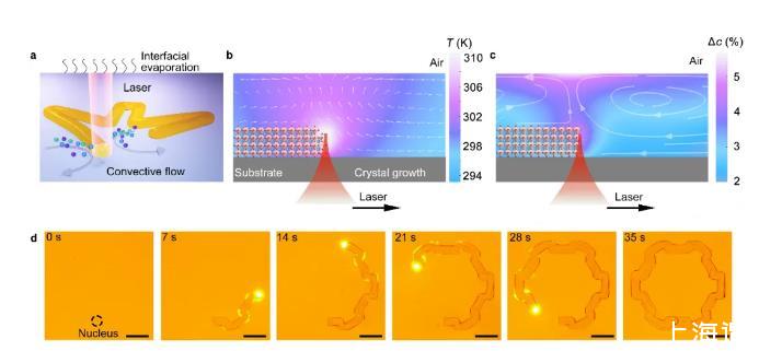 研究者利用COMSOL模擬了激光照射下鈣鈦礦晶體周圍的局域過飽和度,并通過實(shí)驗(yàn)驗(yàn)證了過飽和度產(chǎn)生的原理。其中馬倫格尼對(duì)流的引入加速了傳質(zhì)過程,使得鈣鈦礦結(jié)構(gòu)能夠在激光誘導(dǎo)下快速生長(zhǎng),在實(shí)驗(yàn)中,MAPbBr3鈣鈦礦單晶的生長(zhǎng)速度可達(dá)0.1 mm/s,顯著快于傳統(tǒng)的鈣鈦礦單晶制備方法。激光閾值功率約為150μW,低于現(xiàn)有的激光調(diào)控鈣鈦礦結(jié)晶過程方法。