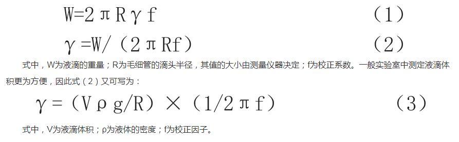 滴體積法的基本原理是這樣的,利用毛細管滴頭,緩慢往下滴液體,這時候測量液滴的大小,就能測定液體的表面張力。這是因為液體的表面張力,與從毛細管滴下的液滴的大小有內(nèi)在關(guān)聯(lián),存在正比關(guān)系,這個關(guān)系可以用數(shù)學(xué)公式表達: