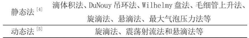 液體表面張力可以通過儀器測定,目前測定方法大體上分為動態(tài)法和靜態(tài)法。這兩大類方法下面由于細分,具體分類如表1。