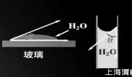 在實際工作中,通常會用到接觸角結(jié)合γg-l氣-液界面張力來判斷鋪展過程是否自動進行。接觸角,是指在固相、液相、氣相這三相的交界點,兩個界面張力(氣-固界面與氣-液界面)之間的夾角,通常用θ表示。如圖1,將水滴滴到玻璃上,接觸角如圖所示。