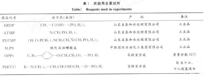 在化學(xué)驅(qū)提高采收率方法中,表面活性劑/堿復(fù)合驅(qū)的驅(qū)油效果比較好,這主要是由于堿與原油中酸性物質(zhì)反應(yīng)生成的活性劑與外加表面活性劑產(chǎn)生了協(xié)同效應(yīng),可以將油水界面張力降至低界面張力區(qū)域(10-2m N/m)甚至超低界面張力區(qū)域(10-3m N/m),并且堿可以降低活性劑在地層中的吸附。但在高堿濃度下,注入堿容易對驅(qū)油體系造成采出液處理困難、引起地層黏土分散和運移、導(dǎo)致地層滲透率下降等負(fù)面作用,并且堿也與油層流體及巖石礦物反應(yīng),形成堿垢,對地層造成傷害并影響油井正常生產(chǎn)。解決結(jié)垢問題的主要方法是加入化學(xué)防垢劑,其中有機膦酸鹽防垢劑因其良好的防垢效果而有廣泛的應(yīng)用。