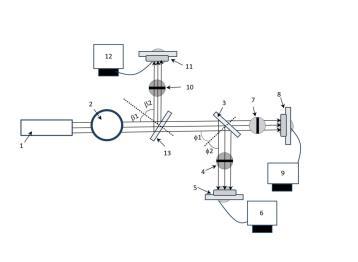 第一分束鏡13與第二分束鏡3之間的距離為5厘米,第二光闌7與第二分束鏡3之間的距離為5厘米,第二光闌7與第二光電探測(cè)器8之間的距離為5厘米。第三光闌4與第二分束鏡3之間的距離為5厘米,第三光闌4與第三光電探測(cè)器5之間的距離為5厘米。入射光與分束鏡法向之間的夾角為,分束鏡法向與反射光之間的夾角為。,。