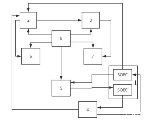 所述供電模塊1包括SOFC-SOEC電池1-1、工業(yè)用電單元1-2、逆變器1-3、高頻感應(yīng)電源1-4,所述工業(yè)用電單元1-2分別與所述SOFC-SOEC電池1-1中的SOEC電解池、所述等離子噴射模塊2連接,所述儲氫模塊4分別與所述SOEC電解池、SOFC燃料電池、等離子噴射模塊2連接,將SOEC電解池電解氫收集存儲的氫氣用于SOFC燃料電池使用、為等離子噴射模塊2中等離子噴射器供應(yīng)電離氣體(氫氣);所述SOFC燃料電池、SOEC電解池均與所述蓄熱模塊5連接。