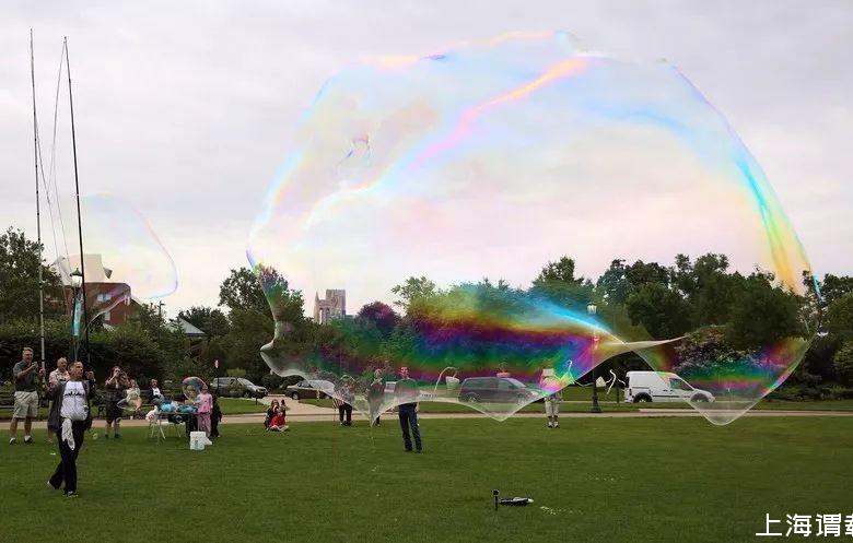 那么,世界上最大的肥皂泡到底有多大呢?目前的吉尼斯世界紀錄是GARY PEARLMAN在2015年創(chuàng)造的,他用巨大的蘸有泡泡溶液的線框成功制造出了一個體積約有96.27立方米的巨大泡泡: