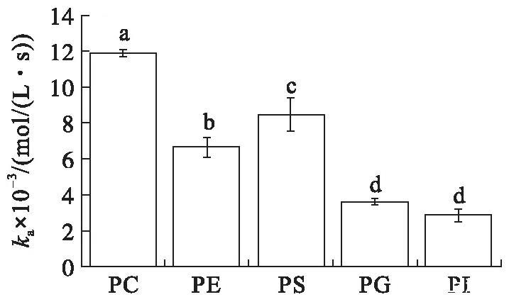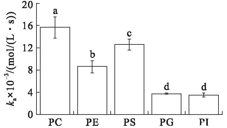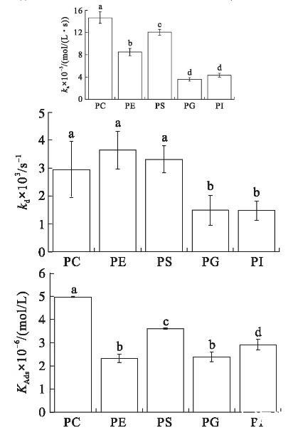 在初始表面壓力為25 mN/m的條件下(見(jiàn)圖4),VhPLD對(duì)PC的吸附常數(shù)最大((1.46±0.10)×104mol/(L·s)),對(duì)于PG((3.58±0.31)×103mol/(L·s))和PI((4.30±0.34)×103mol/(L·s))的吸附常數(shù)最小。在該初始表面壓力條件下,VhPLD對(duì)于PC、PE和PS的解離常數(shù)之間不存在顯著差異(P>0.05),該結(jié)果與在15 mN/m所測(cè)定的結(jié)果保持一致。而在該條件下獲得的VhPLD對(duì)不同磷脂單分子層吸附偏好性順序?yàn)镻C>PS>PI>PE=PG。