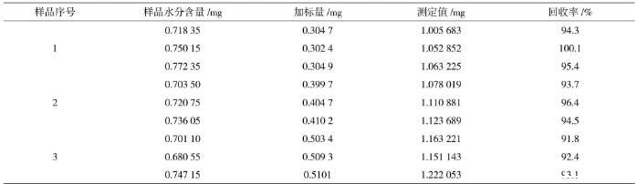 在樣品中加入精密稱取的標(biāo)準(zhǔn)水加標(biāo)水平分別為0.3 mg、0.4 mg、0.5 mg,在150℃加熱10 min的測定條件下,采用滴定度為1 mg/mL的費(fèi)休氏試劑,每個(gè)加標(biāo)水平重復(fù)測定3次,經(jīng)測定,加標(biāo)回收率在91.8%~100.1%,結(jié)果見表6。