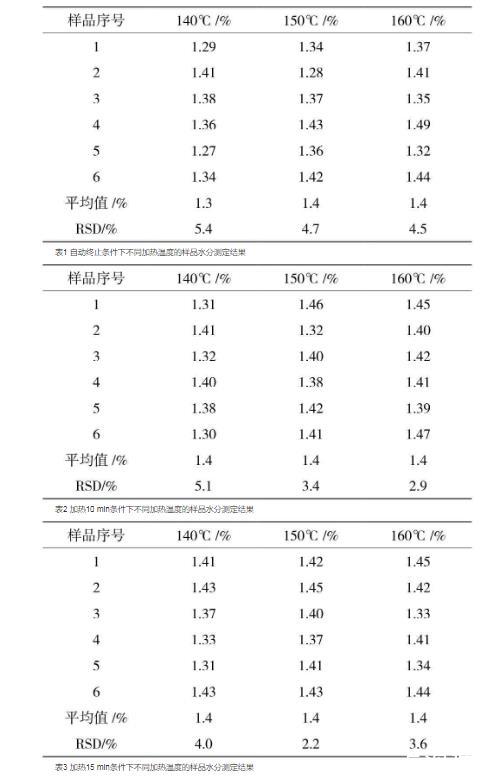 加熱爐樣品轉(zhuǎn)換器的溫度直接影響樣品中水分的蒸發(fā);終止條件也是影響測定結(jié)果的關(guān)鍵因素,加熱時(shí)間太短,樣品中的水分未完全蒸發(fā),導(dǎo)致測定結(jié)果偏低;加熱時(shí)間太長,則延長了測定時(shí)間,環(huán)境因素的影響變大,因此需要選擇合適的終止時(shí)間和加熱溫度[3]。試驗(yàn)分別選擇自動(dòng)終止、加熱10 min和加熱15 min作為終止條件,在不同的終止條件下分別選擇了140、150、160℃作為加熱溫度,每種條件下連續(xù)進(jìn)樣6次。結(jié)果見表1、表2、表3。結(jié)果表明,當(dāng)選擇自動(dòng)終止條件時(shí),三個(gè)加熱溫度的樣品結(jié)果的RSD相對(duì)較大;當(dāng)選擇10 min和15 min作為終止條件時(shí),加熱溫度為150℃和160℃時(shí),樣品結(jié)果的差異較小。因此選擇加熱溫度150℃,終止條件為10 min比較合適。