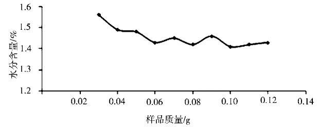 在150℃加熱10 min的測定條件下,樣品稱樣量也會(huì)對(duì)測定結(jié)果有影響[4]。分別稱取0.03g、0.04g、0.05g、0.06g、0.07g、0.08g、0.09 g、0.10g、0.11g、0.12g的樣品質(zhì)量,考察樣品稱樣量對(duì)測定結(jié)果的影響,結(jié)果見圖1。從圖中可以看出,儀器測得樣品水分含量隨著加入樣品質(zhì)量的增大逐漸趨于穩(wěn)定,當(dāng)單次加入的樣品質(zhì)量較小時(shí),測得結(jié)果偏高[5]。稱量樣品質(zhì)量在50~120 mg結(jié)果無明顯差異。