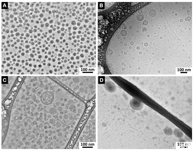 圖 7. (A) LDLs、(B) 脂質(zhì)體、(C) LDLs 和精漿(精漿中的比例為 0.17 mg PC/mg BSP 蛋白)和 (D) 脂質(zhì)體和精漿的冷凍 TEM 圖像 (精漿中 0.16 mg PC 脂質(zhì)體/mg BSP 蛋白的比率)。