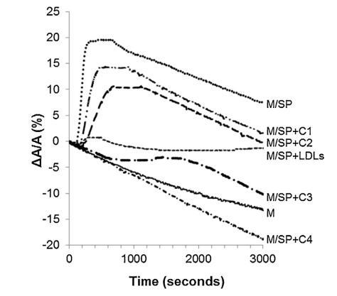 當(dāng)?shù)兔芏戎鞍着c牛精漿混合時 蛋白質(zhì)重量比為 10:1 (BSP:LDLs) 并注射到單層下方,單層的分子面積隨時間記錄 幾乎沒有變化(曲線 M/SP + LDL,圖 5)。 肩膀出現(xiàn)在 大約 400 s 揭示了 BSP 蛋白的弱吸附(這 肩部代表 M/SP 的 5%,上圖曲線)。 然后,該 1000s后分子面積的變化減少并穩(wěn)定。 不會像 M 和 M/SP 曲線的變化那樣減少, 表明 LDLs 成分的吸附,與 它們在界面處的高擴(kuò)散能力(曲線 M/LDL,圖 4)。 因此,SP 中所含 BSP 蛋白在界面處的吸附 由于低密度脂蛋白而大大降低,并且 BSP/低密度脂蛋白的比率非常高 接近最佳值以完全防止 BSP 蛋白質(zhì)影響單層。 磷脂酰膽堿注射量 根據(jù)低密度脂蛋白的組成估計為 4.61 毫克 [33]。 因此,注射了 4.61 mg LDLs 的磷脂酰膽堿 26.6mg精漿蛋白質(zhì),即1mg精漿蛋白質(zhì)需要0.17mg磷脂酰膽堿。