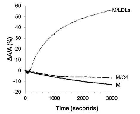 低密度脂蛋白和脂質(zhì)體引入亞相的影響 精子膜仿生外葉的示意圖 在圖 4. 對于控制測量(沒有注入任何保護(hù)劑,設(shè)計為圖 4 中的 M),表面積略有下降 隨著時間的推移。 當(dāng)?shù)兔芏戎鞍妆蛔⑸涞降陀?重建的外葉(圖 4 中的 M/LDL 曲線),它導(dǎo)致了 表面積的快速和大量增加。 相比之下,注入 脂質(zhì)體(圖 4 中的曲線 M/C4)幾乎沒有改變薄膜壓力 單層與參考單層的比較(曲線 米)。 脂質(zhì)從脂質(zhì)體中摻入的動力學(xué) 單層比低密度脂蛋白要慢得多。 因此,有一個弱 在時間尺度上脂質(zhì)體在空氣-水界面的吸附 對應(yīng)于精液的制備。