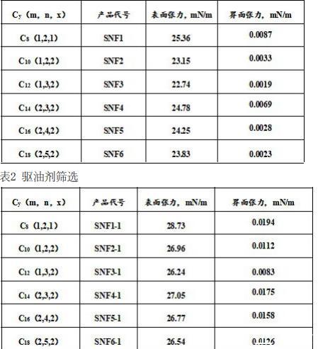 制得的驅、滲一體化驅油劑(SNF1至SNF6)的表面張力和界面張力,測試條件:60℃、5000rpm,濃度均為0.2%,測試結果見表1。表1中,y是驅、滲一體化驅油劑的親油碳鏈主鏈長度,m是對苯乙烯磺酸鈉的反應系數(shù),n是丙烯酰胺的反應系數(shù),x是氟碳陽離子疏水單體的反應系數(shù)。