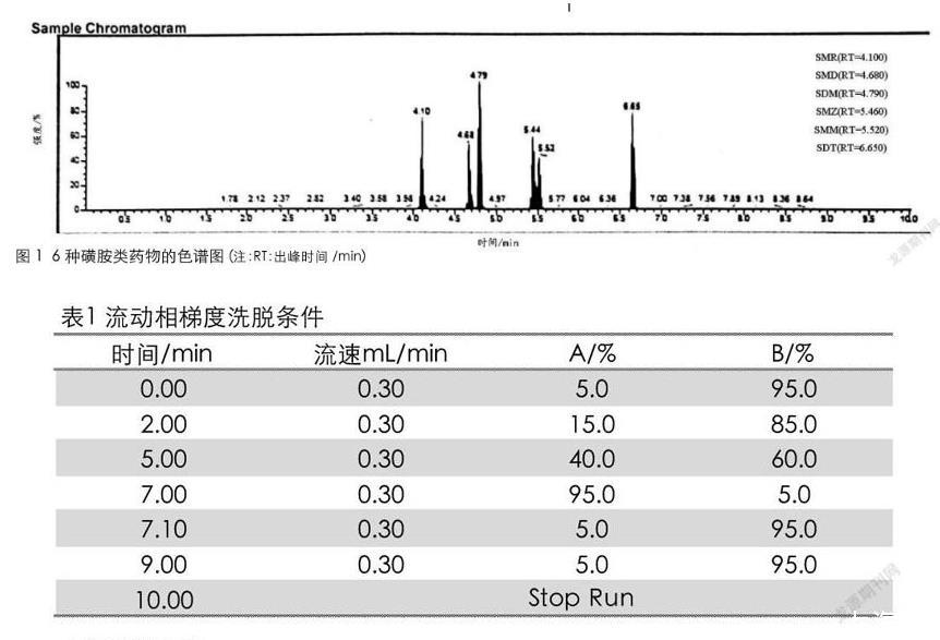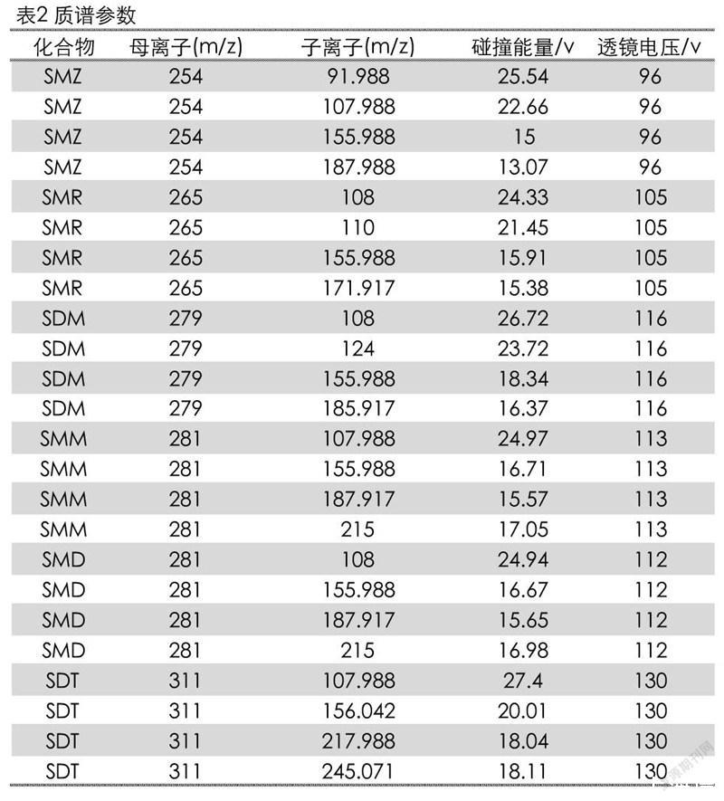 6種磺胺類標準物質(zhì):磺胺甲惡唑(SMZ)、磺胺甲基嘧啶(SMR)、磺胺間二甲氧嘧啶(SDM)、磺胺間甲氧嘧啶(SMM)、磺胺對甲氧嘧啶(SMD)、磺胺地索辛(SDT)(純度均大于99.5%,北京振翔科技有限公司);乙腈(色譜純,德國Merck公司);甲酸(色譜純,上海安普實驗科技有限公司)。