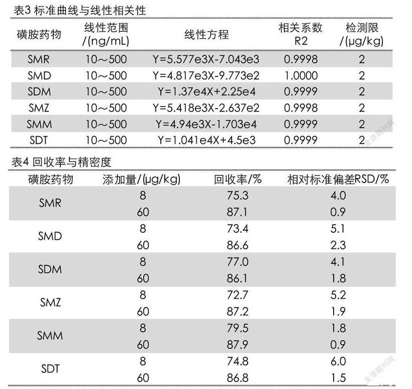 制備混合標準濃度系列,分別為10、50、100、250和500 ng/mL(分別相當于被測組分的含量為2、10、20、50和100μg/kg)。將標準工作液按照2.3.3的方法進樣測試。以進樣濃度為橫坐標,以峰面積的響應(yīng)值為縱坐標繪制標準曲線,結(jié)果如表3所。6種磺胺類藥物在濃度10~500 ng/mL范圍內(nèi)線性關(guān)系很好,相關(guān)系數(shù)R2≥0.9998。