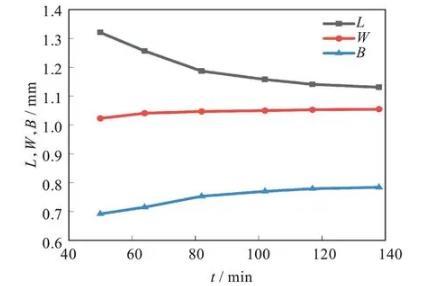 圖7為數(shù)值仿真過程中液滴三軸隨時間演化規(guī)律。綜合對比圖4和圖7,數(shù)值仿真軟件與實驗過程中球形液滴的三軸長度變化趨勢基本一致。可以看出,在體積保持不變的假設下,球形液滴的第二半軸和第三半軸變形頻帶是不一致的。該結果表明一些黏彈性液滴的變形和收縮不嚴格符合仿射變形假設(即第三半軸W始終等于第二半軸B),這與文獻結果類似。數(shù)值仿真結果中液滴最終形態(tài)不是一個三軸長度相等的球形,主要原因是仿真過程中使用的非牛頓流體的本構模型只對黏性項進行了修改,而忽視了彈性應力的影響,因此與理論計算結果有一定誤差。