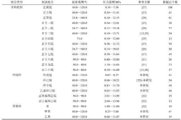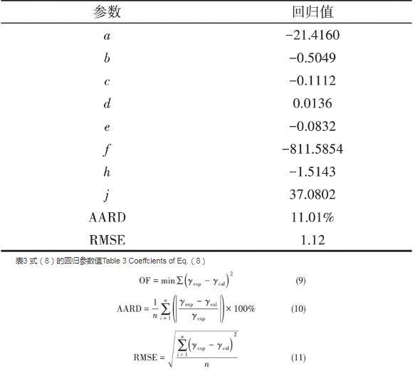 2.4.2實(shí)驗(yàn)數(shù)據(jù)回歸及模型參數(shù)的求取本研究系統(tǒng)收集了文獻(xiàn)數(shù)據(jù),并將研究測(cè)定的實(shí)驗(yàn)數(shù)據(jù),共計(jì)932個(gè)數(shù)據(jù)用于回歸,回歸所用數(shù)據(jù)見表2?;貧w參數(shù)由最小二乘法得到,其目標(biāo)函數(shù)如式(9)所示。采用平均相對(duì)偏差(AARD)和均方根誤差(RMSE)表示計(jì)算效果,如式(10)、式(11)所示?;貧w結(jié)果見表3。