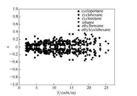 用于擬合的全部數(shù)據(jù)中,86.4%的數(shù)據(jù)的平均相對(duì)偏差在20%以內(nèi)。界面張力小于5 mN/m時(shí),偏差較大。式(8)對(duì)于CO2-正構(gòu)烷烴/芳香烴/不帶支鏈的環(huán)烷烴/芳香烴體系的擬合結(jié)果較好,對(duì)于CO2-帶支鏈環(huán)烷烴體系擬合結(jié)果相對(duì)較差。