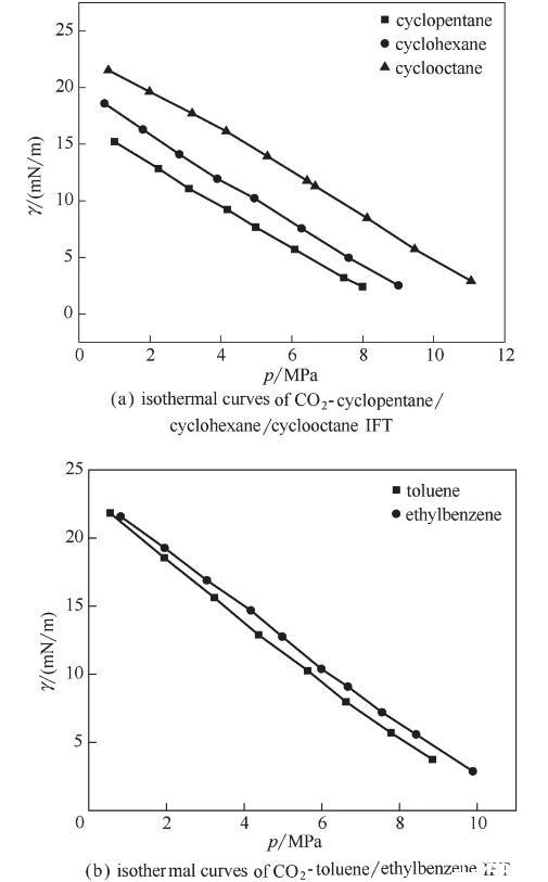 圖4 CO2-不同結(jié)構(gòu)(環(huán)烷烴/芳香烴)界面張力的等溫線