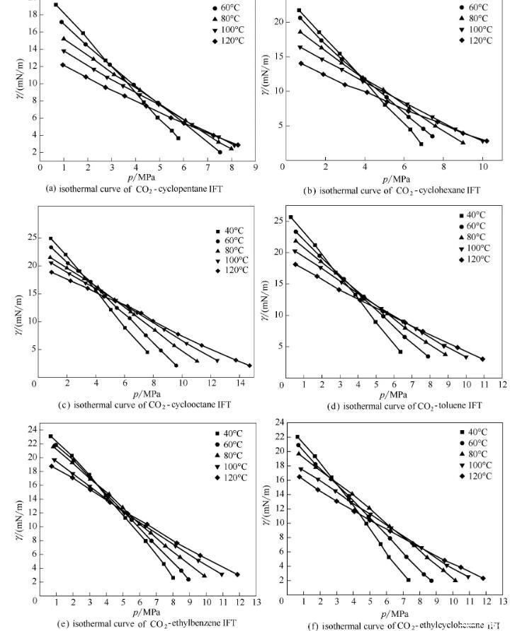 圖6 CO2-相似結(jié)構(gòu)(環(huán)烷烴/芳香烴)界面張力的等溫線