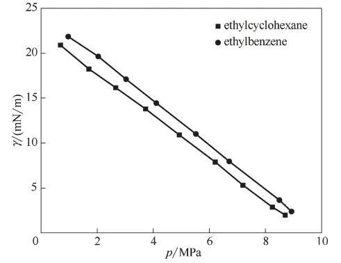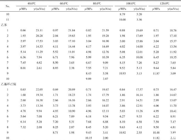 為探究相同碳原子數(shù)、不同結(jié)構(gòu)的影響,選取60℃下CO2-乙基環(huán)己烷/乙苯體系進(jìn)行比較。由圖7可以看出,兩種體系的界面張力下降趨勢(shì)基本相同,但CO2-乙苯的界面張力略高于CO2-乙基環(huán)己烷體系。姬澤敏等、Nagarajan等曾對(duì)CO2-苯/環(huán)己烷體系的界面張力進(jìn)行過(guò)測(cè)定,發(fā)現(xiàn)兩種體系界面張力隨壓力變化的等溫線幾乎重合,而CO2-乙基環(huán)己烷/乙苯體系界面張力差異明顯。從分子層面考慮,這是由于乙苯的極性比乙基環(huán)己烷大,從而導(dǎo)致乙苯分子間的相互作用更強(qiáng),處于界面層的乙苯分子更難擴(kuò)散到CO2中去,使得CO2-乙苯體系的界面張力大于CO2-乙基環(huán)己烷體系。