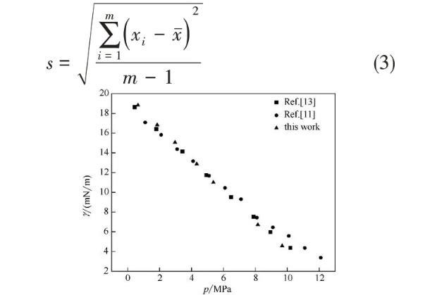 本研究測(cè)定了CO2-環(huán)戊烷/環(huán)己烷/環(huán)辛烷/甲苯/乙苯/乙基環(huán)己烷體系的界面張力,測(cè)量的溫度范圍為40~120℃,壓力范圍為0.27~14.70 MPa。實(shí)驗(yàn)數(shù)據(jù)見表1。并繪出實(shí)驗(yàn)數(shù)據(jù)的標(biāo)準(zhǔn)差圖,結(jié)果如圖3所示。結(jié)果表明,所有數(shù)據(jù)的標(biāo)準(zhǔn)差均在0.36 mN/m以內(nèi),證明數(shù)據(jù)的準(zhǔn)確性較好。其中,標(biāo)準(zhǔn)差的計(jì)算如式(3)所示