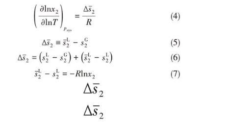 溫度對(duì)界面張力的影響比較復(fù)雜,首先溫度影響界面張力隨壓力的下降速度,隨著溫度的升高,界面張力下降速度越來(lái)越緩,使得不同等溫線在某個(gè)壓力范圍內(nèi)有交叉點(diǎn);其次,不同區(qū)域內(nèi),溫度對(duì)界面張力的影響不同。在交叉點(diǎn)以上,界面張力隨溫度的升高而減小,而交叉點(diǎn)之下,界面張力隨溫度的升高而增大。為了分析溫度對(duì)CO2溶解度的影響,將Gibbs-Helmholtz方程計(jì)算的溶解度對(duì)溫度的導(dǎo)數(shù)與偏摩爾熵聯(lián)系起來(lái),如式(4)~式(7)所示