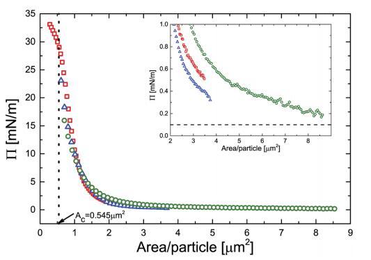 壓力面積等溫線(xiàn)是通過(guò)壓縮獲得 在朗繆爾槽上涂抹單層膜,用于 3 組不同的 實(shí)驗(yàn)。 這些等溫線(xiàn)中的區(qū)域坐標(biāo)被縮放 由吸附在界面上的顆粒數(shù)量決定。 一切 曲線(xiàn)折疊成單個(gè)圖,如圖 1 所示。 增加壓縮,壓力最初變化很小,但 每個(gè)顆粒低于 2 mm2,壓力會(huì)急劇增加。 曲線(xiàn)的斜率首先增加,但達(dá)到 最大在 ~27 mN m- 1 處有一個(gè)拐點(diǎn) 其次是稍弱的斜率。 面積值 對(duì)應(yīng)于該拐點(diǎn)的粒子 (Ac) 結(jié)果為 為 0.545 mm2,如圖 1 中的虛線(xiàn)所示。假設(shè) 顆粒緊密堆積,這對(duì)應(yīng)于~835 nm 的顆粒間距離,遠(yuǎn)大于 在本體中測(cè)量的顆粒的流體動(dòng)力學(xué)直徑 溶液 (590 nm) 表明顆粒確實(shí)是 大幅度變形。 如圖 1 的插圖所示,有限 0.5 mN m- 1 級(jí)的表面壓力(即遠(yuǎn)高于我們的 檢測(cè)限為 0.1 mN m- 1 ) 事實(shí)上已經(jīng)可以測(cè)量了 每個(gè)粒子的面積約為 4 mm2 . 插圖還表明 P 的絕對(duì)值可再現(xiàn)在 0.3 mN m- 1 以?xún)?nèi) 在兩個(gè)不同朗繆爾的不同實(shí)驗(yàn)之間 槽。