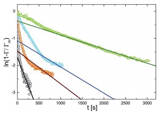 圖 6 ln(1 - r/rm) 作為不同體積濃度的時(shí)間函數(shù) 微凝膠顆粒:(>)0.10 g l-1 , (D)0.20 克 l-1 , (,)0.50 克 l- 1 , (乙) 1.00 克 l- 1 . 實(shí)線(xiàn)是直線(xiàn)擬合。