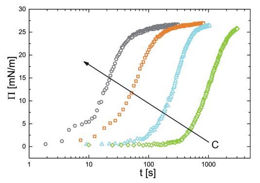 已經(jīng)建立了一個(gè)狀態(tài)方程來(lái)關(guān)聯(lián) 表面壓力和吸附量,我們現(xiàn)在繼續(xù) 研究顆粒的吸附動(dòng)力學(xué)。 為此我們 監(jiān)測(cè)新鮮的界面張力的演變 在 PNIPAM 顆粒懸浮液中制備氣泡作為 時(shí)間的函數(shù)。 我們轉(zhuǎn)換界面張力值 轉(zhuǎn)化為表面壓力。 結(jié)果如圖 4 所示。 表面壓力值最初迅速增加,然后 放松到最終的平衡值。 動(dòng)態(tài)可以一目了然 分為兩個(gè)獨(dú)立的時(shí)間尺度:初始快速 由表面壓力增加表示的動(dòng)力學(xué) 值,以及隨著系統(tǒng)向最終放松而緩慢的部分 平衡狀態(tài)。 快速動(dòng)力學(xué)之間的這種區(qū)別 短時(shí)間和長(zhǎng)時(shí)間慢得多的動(dòng)力學(xué)是許多表面活性物質(zhì)的吸附行為的特征 材料.32,33