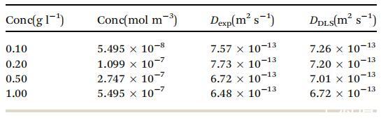 表 1 擴(kuò)散系數(shù) D (m2 s- 1 ) 對(duì)于各種 從實(shí)驗(yàn) G vs. t1/2 曲線(xiàn)計(jì)算的濃度 與使用 DLS 測(cè)量的相比
