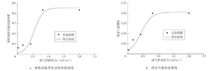 圖3凝析油臨界流動飽和度、殘余氣飽和度隨界面張力變化的回歸曲線