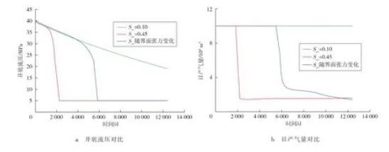 設(shè)計(jì)機(jī)理模型和數(shù)值模擬方案,建立組分模型分析變凝析油氣臨界流動飽和度對開發(fā)指標(biāo)預(yù)測的影響,模型網(wǎng)格為50×50×7,滲透率為10×10-3μm2,孔隙度為15%,地質(zhì)儲量為10×108m3。設(shè)計(jì)日產(chǎn)氣量為10×104m3,最小井底流壓為5 MPa,以及Scc=0.10、Scc隨界面張力變化及Scc=0.45時(shí),預(yù)測凝析油臨界流動飽和度及不同方案的生產(chǎn)特征。