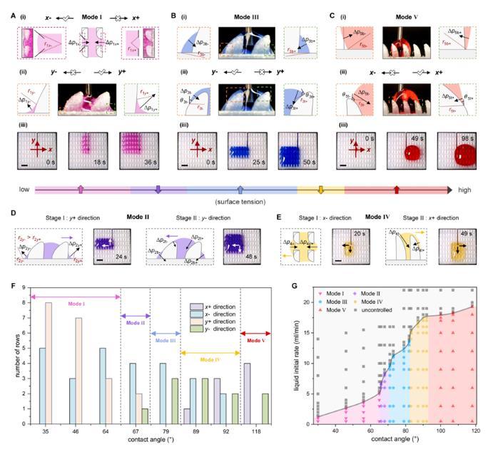 注入結(jié)構(gòu)化表面的液體首先填充相鄰四個(gè)單元間的空隙,并在單元的特定曲率結(jié)構(gòu)處形成局部曲率不等的液體彎月面,這導(dǎo)致液體表面不同位置的拉普拉斯壓差不同,進(jìn)而驅(qū)動(dòng)液體定向運(yùn)輸。隨表面張力從低到高(22-72 mN/m),液體呈現(xiàn)出五種不同的運(yùn)輸模式(I至Ⅴ)。研究人員利用水-乙醇溶液對(duì)這五種模式下液體沿x軸和y軸方向上的運(yùn)輸行為進(jìn)行力學(xué)分析(圖2)。表面張力較低的液體對(duì)界面的潤(rùn)濕性較高,因此主要在單元底部曲率結(jié)構(gòu)作用下,沿拉普拉斯壓差較低的方向運(yùn)輸;而表面張力較高的液體會(huì)在結(jié)構(gòu)化表面上積累,其運(yùn)輸方向由單元頂部曲率調(diào)控。