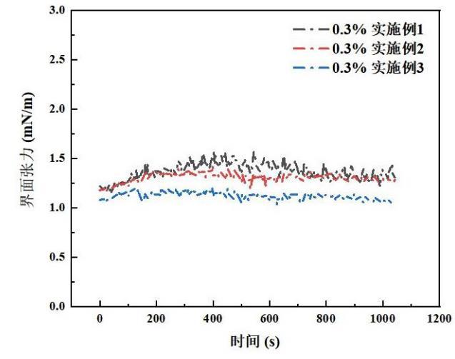 采用克呂士SDT旋轉(zhuǎn)滴界面張力儀分別測量原油(粘度723.7 mPa·s)滴入各實施例的地層水溶液后的界面張力(IFT),其中,各實施例在地層水中的質(zhì)量濃度為0.3%,并將原油滴入地層水中作為對照組進(jìn)行測量,測得對照組界面張力為21.6mN/m,其余各實施例測量結(jié)果如圖所示??梢钥吹?,原油與三種實施例溶液混合后的體系的IFT可降低至1.25~1.46mN/m,證明了硅基納米原位乳化減阻劑具有良好的界面張力降低效果。
