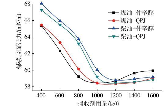 使用QPJ做起泡劑時(shí),煤漿表面張力在煤油用量為1000 g/t時(shí)達(dá)到最低值,在煤油用量超過1400 g/t后開始明顯回升;煤漿表面張力在柴油用量達(dá)到1200 g/t時(shí)達(dá)到最低值,在超過1400 g/t后開始回升。由此可見,捕收劑對(duì)煤漿的表面張力有著較為顯著的影響。