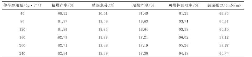 在浮選過程中,煤油作為捕收劑能與煤顆粒作用,影響煤顆粒的潤濕或疏水性;仲辛醇作為起泡劑,能夠在氣—液界面吸附濃集,降低氣—液界面的表面能,生成直徑較小的氣泡,起到起泡作用;煤油和仲辛醇共同使用時(shí),兩種藥劑在氣—液界面有聯(lián)合作用,產(chǎn)生共吸附現(xiàn)象[4]。