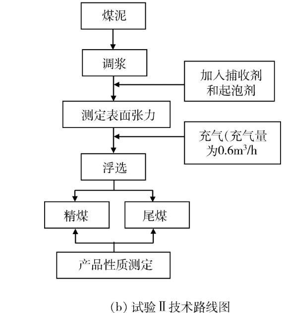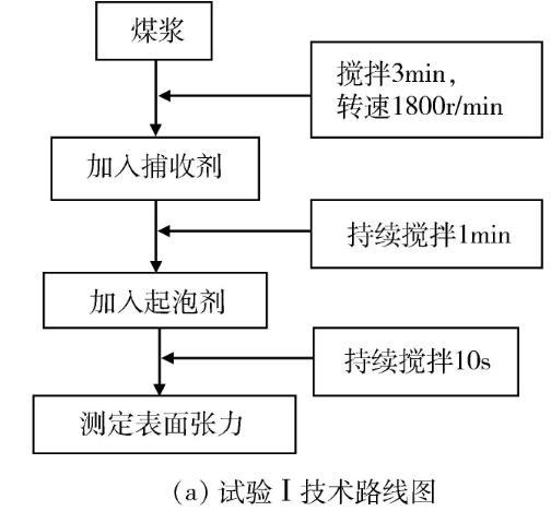 試驗(yàn)分為試驗(yàn)Ⅰ和試驗(yàn)Ⅱ兩部分。在試驗(yàn)Ⅰ中,先后改變捕收劑和起泡劑用量,對(duì)添加浮選藥劑后煤漿的表面張力進(jìn)行測定,以研究浮選藥劑用量對(duì)煤漿表面張力影響的規(guī)律。在試驗(yàn)Ⅱ中選用煤油/仲辛醇做捕收劑/起泡劑,先后改變煤油和仲辛醇的用量,按照《GB/T 4757-2013煤粉(泥)實(shí)驗(yàn)室單元浮選試驗(yàn)方法》對(duì)馬蘭2#煤泥進(jìn)行浮選試驗(yàn),并在浮選充氣前對(duì)煤漿同步進(jìn)行表面張力的測定,進(jìn)一步對(duì)浮選過程中浮選藥劑量、煤漿表面張力及浮選效果之間的關(guān)系進(jìn)行探索。試驗(yàn)控制煤漿濃度為100 g/L,溫度為22±0.2℃;使用一次去離子水(pH值為7.0±0.2)。試驗(yàn)技術(shù)路線見圖1。