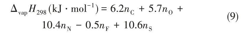 2005年,Kabo等[37]用Knudsen滲流法測(cè)出了[C4mim][Tf2N]的蒸氣壓,從而計(jì)算得到汽化焓,Kabo等基于有效原子的相加性提出式(9)計(jì)算298 K的汽化焓