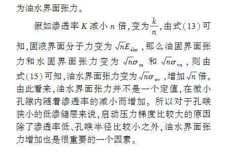 式(15)可知,油水界面張力變?yōu)閚σow,增加n倍。由此看來,油水界面張力并不是一個(gè)定值,在微小孔隙內(nèi)隨著滲透率的減小而增加。所以對于孔喉狹小的低滲儲(chǔ)層來說,啟動(dòng)壓力梯度比較大的原因除了滲透率低、孔喉半徑比較小之外,油水界面張力增加也是很重要的一個(gè)因素。